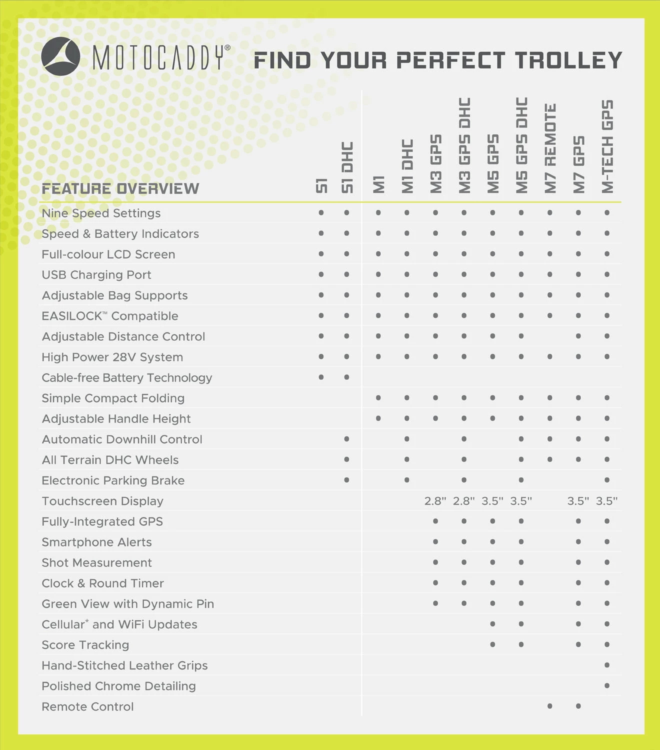 Brand-new for this season, the Motocaddy 2022 M3 GPS DHC Electric Golf Trolley is loaded with many game-enhancement features such as a Clock, Round Timer, Par and Stroke Index Information, Shot Distance Measurement, Automatic Hole Advancement, and a Battery Meter and more.