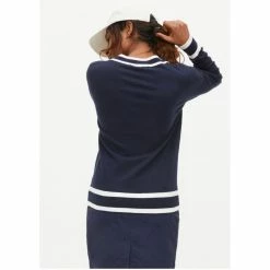 The Rohnisch Annie Golf Sweater in Navy is Classically styled, the regular fit sweater, is a must for the staple Golf Wardrobe. Made from 76% Organic Cotton, the beautifully soft, plain knit has decorative stripes to both the neckline and cuffs to create a truly retro sweater.
